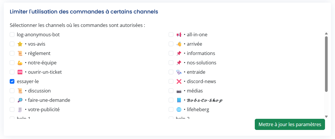 Cette section permet de restreindre l'utilisation des commandes du bot à des channels spécifiques.