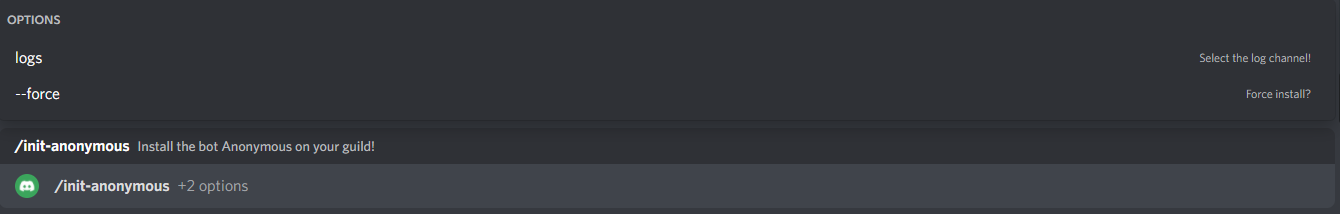 /init-anonymous --forceVous pouvez également changer le salon des logs au moment de la commande d'installation avec l'option logs. Il vous suffira de préciser le channel (texte) que vous voudrez utiliser pour les logs.