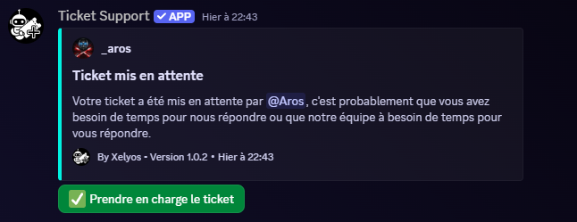 Marquez le ticket comme “pris en charge” afin d’indiquer qu’un membre du staff s’en occupe.